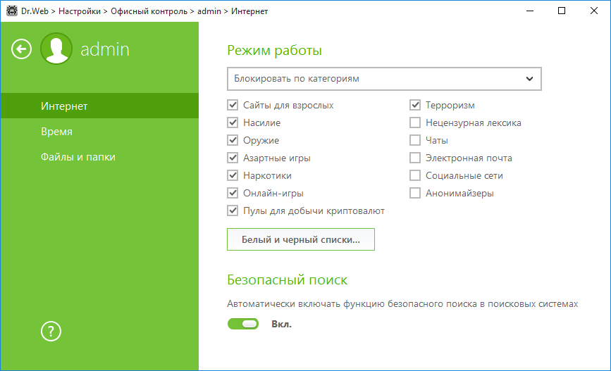 По умолчанию для всех пользователей установлен режим Без ограничений. Для изменения настроек, в выпадающем списке выберите другой режим. Блокировать по категориям Один и тот же сайт может быть отнесен сразу к нескольким различным категориям. В этом случае модуль Офисный контроль блокирует доступ к сайту, если он попадает хотя бы в одну из категорий, включенных для запрета доступа. В этом режиме вы можете указать категории тех ресурсов, доступ к которым вы хотите ограничить: