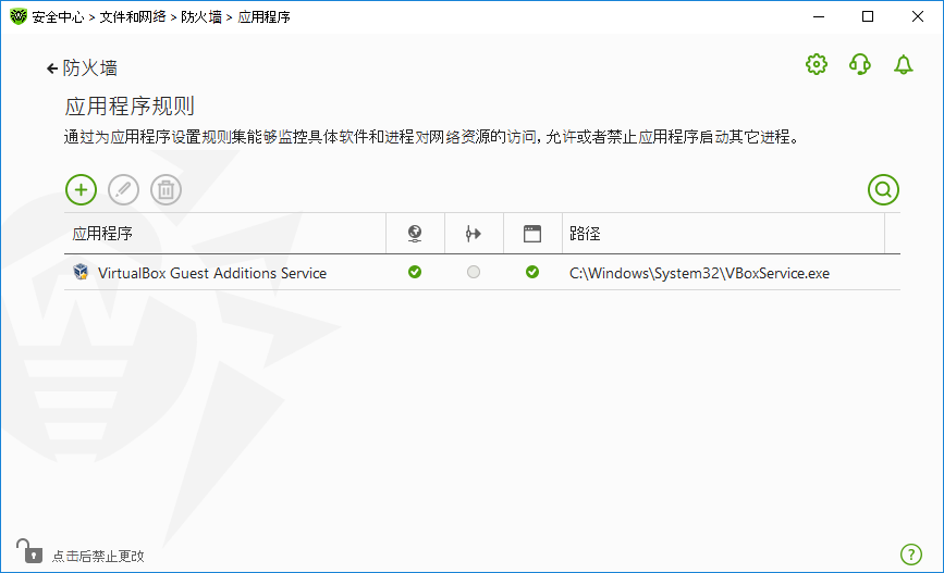打开应用程序规则窗口的操作 1.打开Dr.Web菜单 2.在打开的窗口点击文件和网络。 3.确认Dr.Web的运行模式是管理员模式(软件下方的锁头为“开启”状态 4.点击防火墙图标。打开组件参数窗口。 5.在应用程序规则设置部分点击更改。打开已设置有规则的应用程序的列表。 ![]() 图52. 应用程序规则 6.创建新规则集或编辑现有规则需多加 已从计算机上删除的应用程序的规则不会被自动删除。用户可以在列表菜单选择删除不使用的规则来删除这些规则。 编辑现有规则集或创建新规则集 用户可以在适用于应用程序的新规则集(或编辑规则集 <应用程序名称>)窗口设置应用程序访问网络资源的权限,并禁止或允许启动其他应用程序。 ![]() 图53. 创建新规则集 启动其他应用程序 如需允许或禁止应用程序其他启动应用程序,请在弹出的启动网络应用程序列表中选择: •允许即允许应用程序启动进程; •阻止即禁止应用程序启动进程; •未指定. 这种情况下所选择的防火墙运行模式设置将适用于此应用程序; 对网络资源的访问 1.选择对网络资源的访问模式: •全部允许⸺允许所有应用程序连接; •全部阻止⸺禁止所有应用程序连接; •未指定⸺这种情况下所选择的防火墙运行模式设置将适用于此应用程序; •自定义⸺该模式下用户可以指定允许或禁止应用程序连接的规则集。 2.如果用户对网络资源的访问选择了自定义,则该应用程序规则集相关信息表格如下。