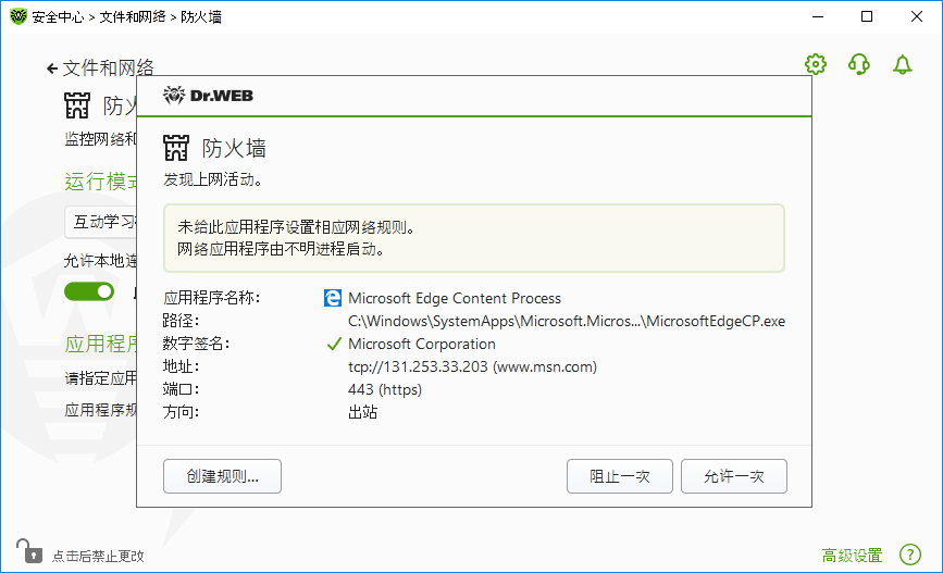 2.请确定在这种情况下合适的操作并在窗口下端选择相应操作: •一次性禁止应用程序访问指定端口需选择的操作是阻止一次; •一次性允许应用程序访问指定端口需选择的操作是允许一次; •如需转到过滤规则创建表格,请选择创建规则。在弹出的窗口可选择预定义规则或手动创建自定义规则。 3.点击确定按钮。防火墙将执行指定操作,通知窗口将关闭。