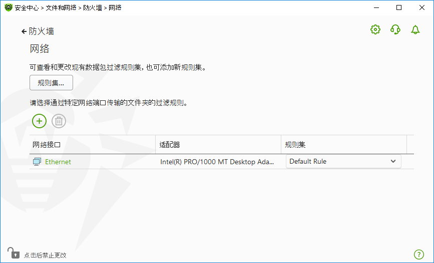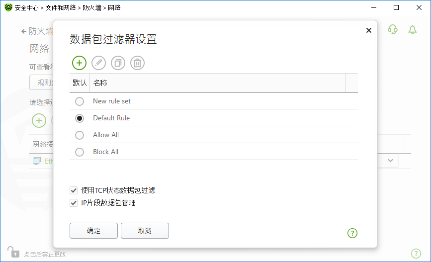在网络窗口可指定通过特定接口传输的数据包的过滤规则。 打开网络窗口的操作 1.打开Dr.Web菜单 2.在打开的窗口选择文件和网络。 3.确认Dr.Web的运行模式是管理员模式(软件下方的锁头为“开启”状态 4.点击防火墙图标。打开组件参数窗口。 5.打开组高级设置。 6.在适用于已知网络的运行参数设置部分点击更改。打开已设置有规则的网络接口的列表。 ![]() 图55. 适用于网络接口的规则集 7.请在列表中查找到所需接口并与相应规则集对应。如果列表中没有相应的规则,可创建规则。 防火墙具有下列预先设定的规则: •Default Rule⸺描述最常见网络配置并传播攻击的规则(默认针对所有新接口使用这一规则); •Allow All⸺所有数据包都可通过; •Block All⸺所有数据包都不可通过。 为了便于操作,快速切换过滤模式,用户可以指定补充规则。 如需查看所有可用接口或添加新接口,请点击 可点击 点击网络接口名称可查看其参数。 数据包过滤器设置 管理现有规则或添加新规则需打开数据包过滤器设置窗口,之后点击规则集。 ![]() 图56. 数据包过滤器设置窗口 在此页面可以: •生成过滤规则集,通过创建新规则、修改现有规则或删除不需要的规则; •设定补充过滤参数。 生成规则集需执行下列任一操作: •为网络接口创建规则集请点击 •修改现有规则集,请在列表中选择相应规则集后点击 •添加现有规则集备份,请点击 •删除所选规则集,请点击 设定数据包过滤高级设置,需在数据包过滤器设置中勾选下列选项: