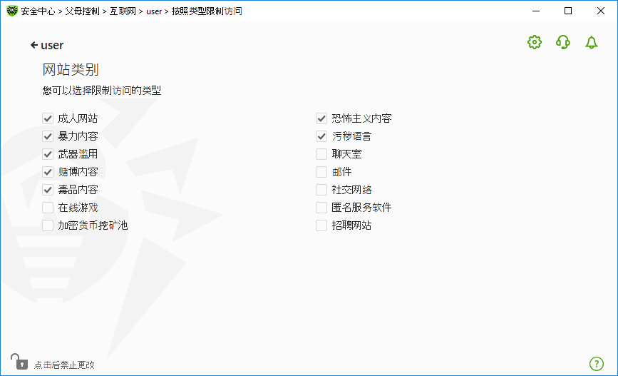在互联网标签可阻止用户浏览不良网站(包含暴力、赌博等内容的网站),也可允许用户仅访问指定的网站。默认为所有用户设定的模式都是不限制。还可以选择的模式有: •按照类型限制访问 •只允许访问白名单网站 ![]() 图105. 选择父母控制运行模式 模式按照类型限制访问 在这一模式下可指定需阻止访问的网站类型。同一网站可能同时属于不同的类型。这种情况下只要其所属的一个类型为禁止访问,父母控制就会禁止访问这一网站。判断网站类型时还会使用Dr.Web云服务中的数据。 在这一模式下还可以自行指定禁止访问或允许访问的网站,方式是利用网站黑白名单。