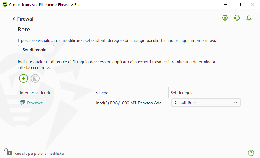 Nella finestra Rete è possibile impostare un set di regole di filtraggio dei pacchetti trasmessi attraverso una specifica interfaccia. Per andare alla finestra Rete 1.Aprire il menu Dr.Web 2.Nella finestra che si è aperta selezionare la sezione File e rete. 3.Assicurarsi che Dr.Web funzioni in modalità amministratore (il lucchetto nella parte inferiore del programma è "aperto" 4.Fare clic sulla piastrella Firewall. Si aprirà la finestra dei parametri del componente. 5.Espandere il gruppo Impostazioni avanzate. 6.Nella sezione delle impostazioni Parametri di utilizzo per le reti conosciute premere Modifica. Si aprirà una finestra con una lista di interfacce di rete per cui sono impostate le regole. ![]() Immagine 55. Set di regole per interfacce di rete 7.Trovare nella lista l'interfaccia desiderata e abbinarla al set di regole corrispondente. Se nella lista non è disponibile un set di regole adatto, crearlo. Firewall viene fornito con i seguenti set di regole predefiniti: •Default Rule — le regole che descrivono le configurazioni di rete più comuni ed attacchi diffusi (si usa di default per tutte le nuove interfacce); •Allow All — tutti i pacchetti vengono consentiti; •Block All — tutti i pacchetti vengono bloccati. Per un utilizzo comodo e un passaggio veloce tra le modalità di filtraggio, si possono impostare ulteriori set di regole. Per vedere tutte le interfacce disponibili o aggiungere alla tabella una nuova interfaccia, premere il pulsante Le interfacce di rete non attive possono essere cancellate dalla tabella visualizzata, premendo il pulsante Per visualizzare i parametri di un'interfaccia di rete, fare clic sul suo nome. Impostazioni del filtro pacchetti Per gestire i set di regole esistenti e per aggiungerne nuovi, andare alla finestra Impostazioni del filtro pacchetti premendo il pulsante Set di regole. ![]() Immagine 56. Finestra Impostazioni del filtro pacchetti Su questa pagina è possibile: •gestire i set di regole di filtraggio creando nuove regole, modificando quelle esistenti o eliminando regole non richieste; •impostare i parametri di filtraggio addizionali. Per gestire un set di regole, eseguire una delle seguenti azioni: •per creare un set di regole per un'interfaccia di rete, premere •per modificare un set di regole esistente, selezionarlo dalla lista e premere •per aggiungere una copia di un set di regole esistente, premere •per rimuovere un set di regole selezionato, premere Per configurare le impostazioni avanzate del filtraggio pacchetti, nella finestra Impostazioni del filtro pacchetti selezionare i seguenti flag: