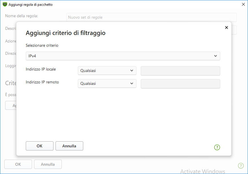 Se in questa regola all'interno dell'intestazione IPv4 per i parametri Indirizzo IP locale e Indirizzo IP remoto viene impostato il valore Qualsiasi, la regola scatterà per qualsiasi pacchetto contenente l'intestazione IPv4. Indirizzo IP locale è l'indirizzo IP della scheda di rete del computer su cui viene configurato Firewall, e Indirizzo IP remoto è l'indirizzo del nodo da cui vengono ricevuti i pacchetti in entrata o a cui vengono indirizzati i pacchetti in uscita. |