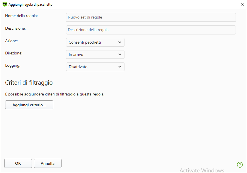 Per aggiungere o modificare una regola di filtraggio 1.Nella finestra di configurazione del set di regole per il filtro dei pacchetti premere il pulsante ![]() Immagine 58. Aggiunta di una regola di filtraggio 2.Impostare i seguenti parametri della regola: